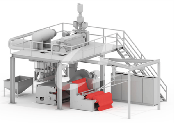 熔噴布的主要設備構成: 上料機、螺桿擠出機、計量泵、熔噴模頭組合件、羅茨風機、空氣加熱器、接收裝置、卷繞裝置。 生產聚酯等原料,還需要切片干燥裝置。生產輔助設備主要有模頭清潔爐、靜電施加裝置和噴霧裝置等。