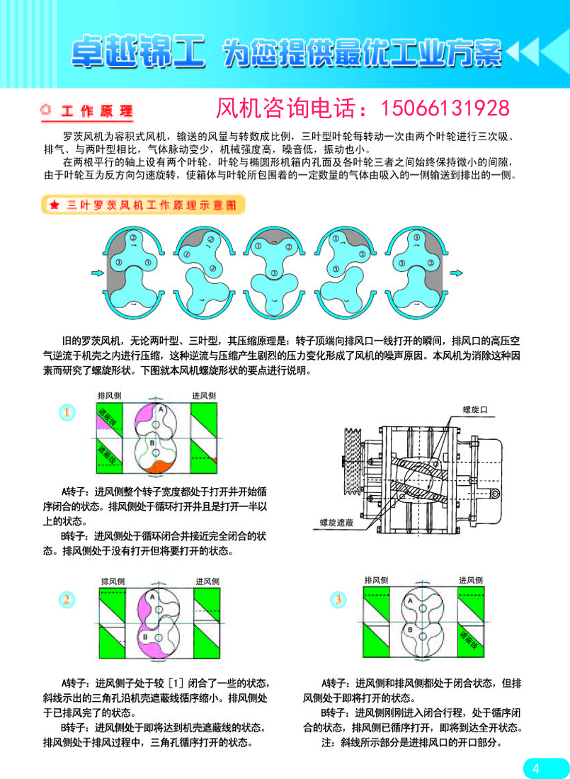 舊的羅茨鼓風機,無論兩葉型、三葉型,轉子頂端向排風口一線打開的瞬間,排風口的高壓空氣逆流于機殼之內進行壓縮,從而產生劇烈的壓力變化,形成了風機的噪音。本風機為消除這種因素而研究了螺旋形狀。詳細了解三葉羅茨風機與兩葉羅茨風機性能對比文章地址:http://www.yapaishop.com/archives/3690