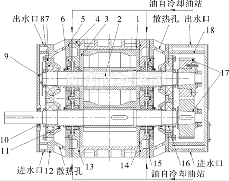 1. 機(jī)殼 ; 2. 轉(zhuǎn)子部; 3. 側(cè)板; 4. 隔板; 5. 墻板; 6. 機(jī)械密封部; 7. 軸承; 8. 軸承座; 9. 副油箱; 10. 骨架油封; 11. 骨架油封; 12. 油箱密封墊; 13.O 形圈; 14. 側(cè)板密封墊; 15. 墻板密封墊; 16. 軸承; 17 . 齒輪部 ; 18. 齒輪箱 .