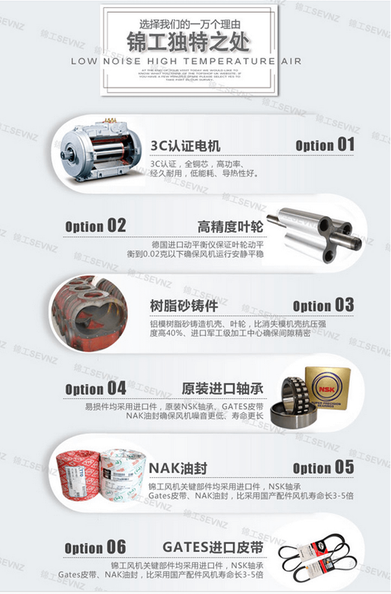旋渦高壓風機特點:高壓,錦工量,低嗓音,輕量化 采用鋁合金材質,大幅降低重量,達到輕量化的目的 馬達為IEC設計(1HP以上),全閉外扇型鋁械馬達,特殊軸心設計,可適合長時間使用 特殊葉片設計,壓力高,風量大,噪音低,壽命長。 特殊風量調節風門,風量控制穩定性高,操作容易