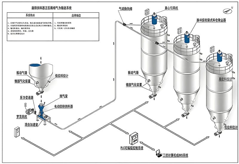 倉泵可以實現理想中的遠距離氣力輸送。目前,在國內的案例中,輸送距離超過2000米以上并且穩定運行的只有濃相氣力輸送系統。